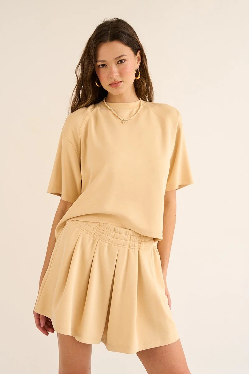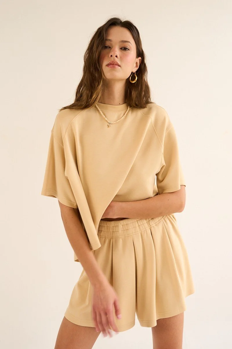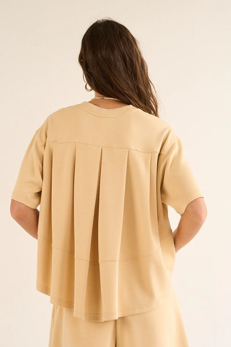 Crafted from an ultra-soft blend of modal and polyester, this elevated crewneck tee brings everyday comfort to a whole new level. Designed with above-elbow sleeves for a modern touch, the standout features lies in the back - delicate cascade beneath the yok, adding unexpected movement and sophistication. It feels like your favorite tee, but looks like so much more!